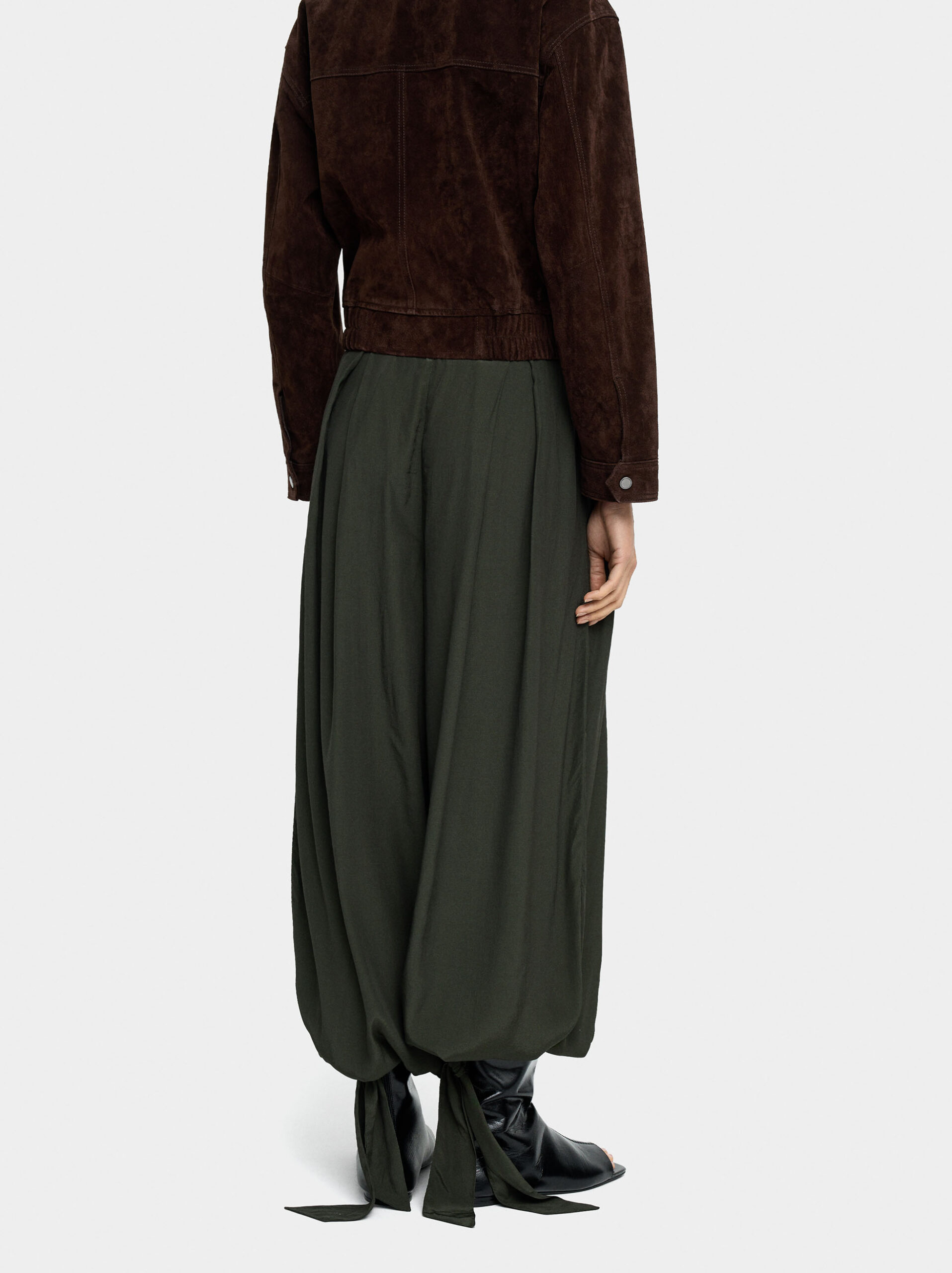 Flowy balloon trousers featuring ankle tie straps for adjustable fit and a relaxed silhouette. Side pockets and a side zipper closure provide function while the gathered ankle creates a contemporary proportion—ideal for casual or styled looks.