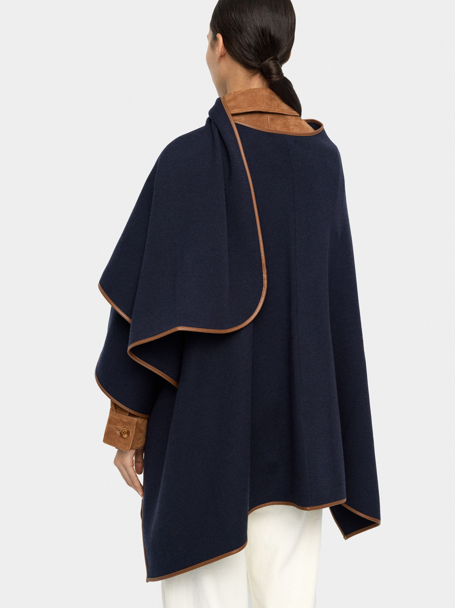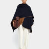 Knit poncho in a soft wool-blend with marked topstitching along the edges and side openings for ease of movement. Finished with a leather-effect buckle closure for a contemporary accent. Designed to flatter many shapes; now provided in S, M, L for platform compatibility.