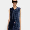 A richly textured jacquard top with a velvet leaf motif and subtle iridescent effect. The mandarin collar and overlapping front with tie closure add refined interest—perfect for elevated styling.
