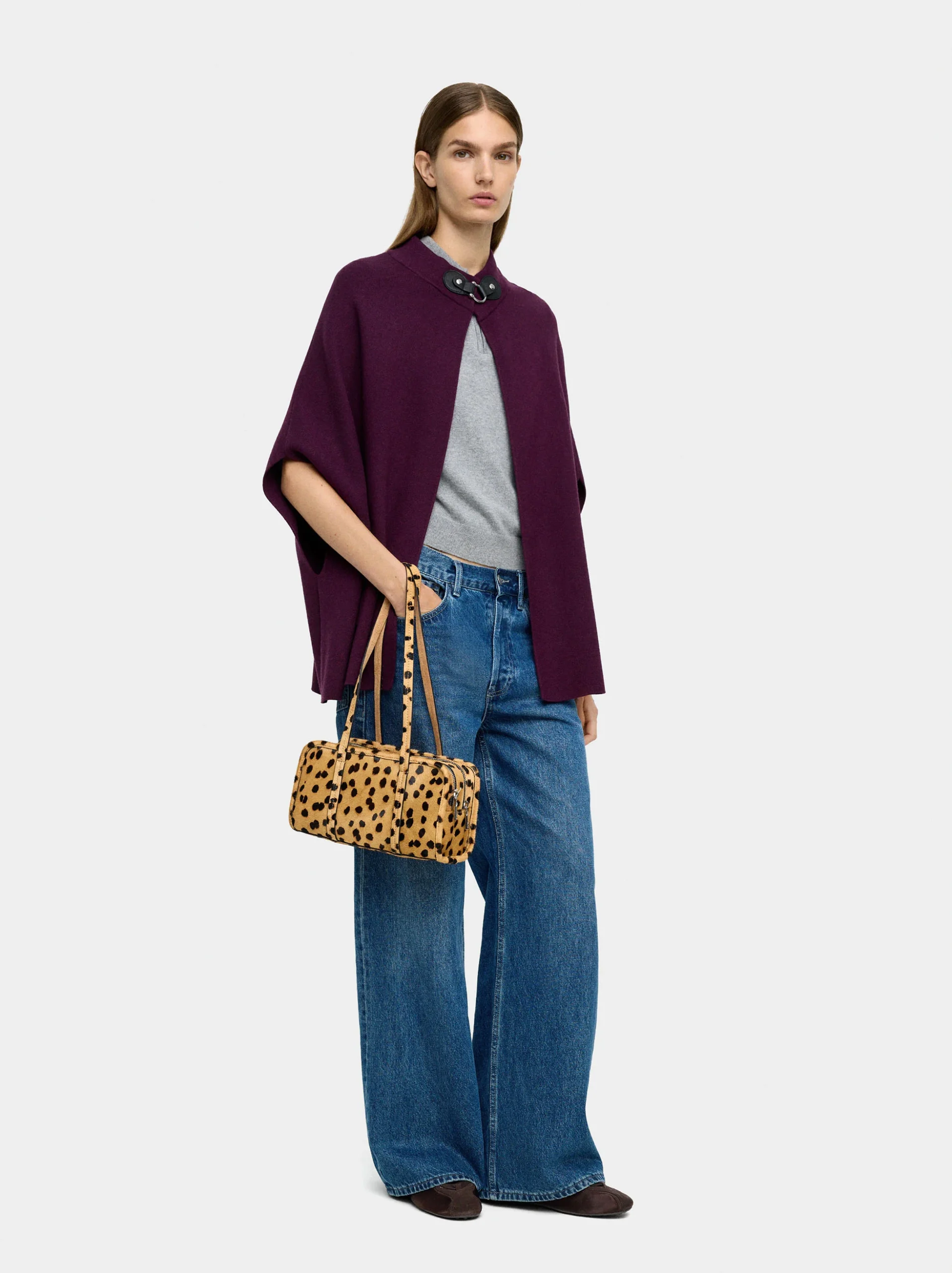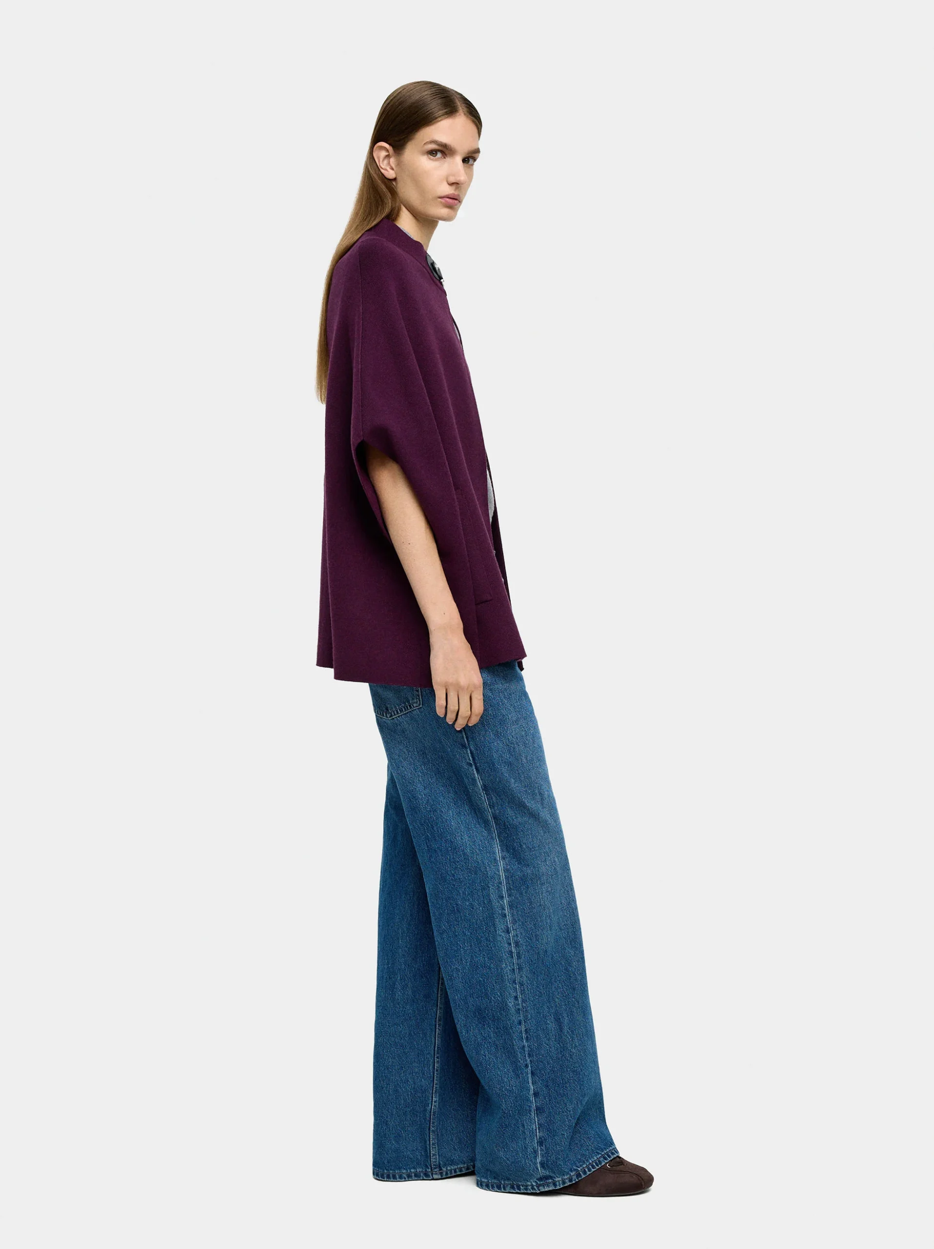 A rich-toned knit poncho with a detachable faux-fur collar and thoughtful tailoring touches like lower side slits and a button front. Sized to suit a wide range of body types, this piece layers effortlessly and adds tactile interest to outfits thanks to its cozy yarn and luxe collar detail. Perfect for travel or layering at home, it elevates simple looks with an elegant finish.