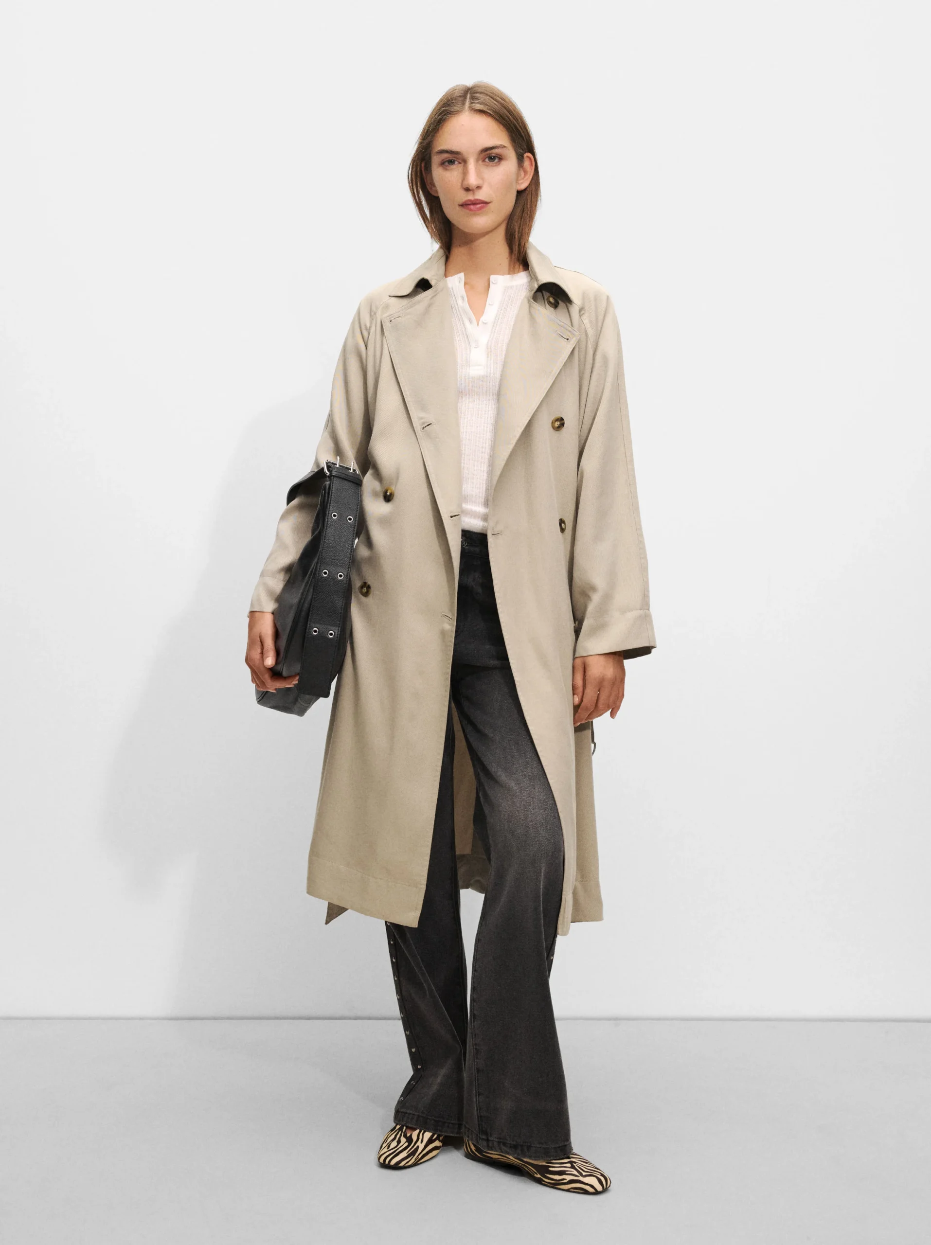 A lightweight lyocell trench coat with a classic shirt collar, adjustable waist belt and practical side pockets. Tailored with a clean button fastening and long sleeves, this coat offers a refined silhouette that works for both formal and casual layering. The breathable lyocell fabric drapes beautifully and is perfect for transitional seasons.