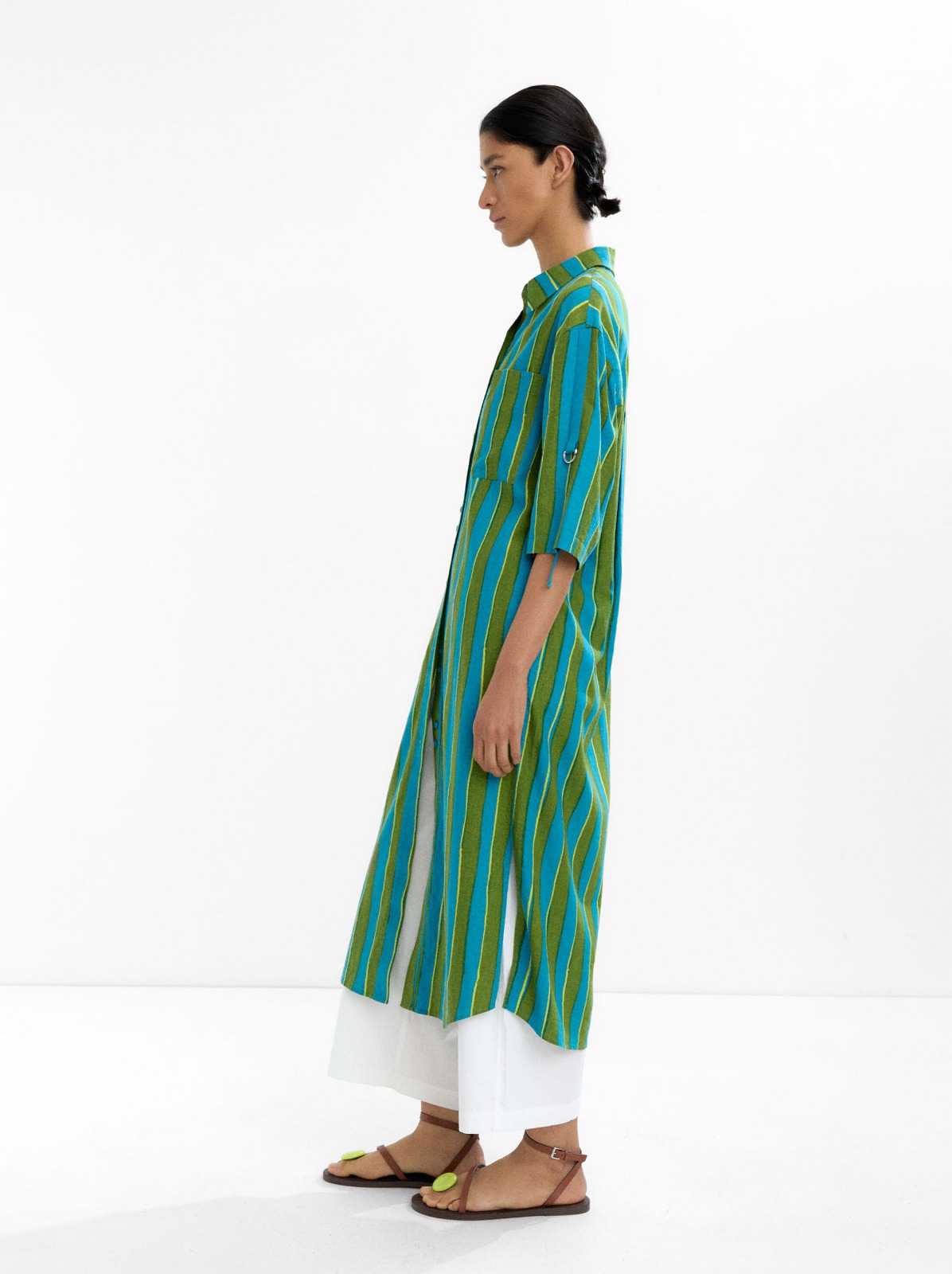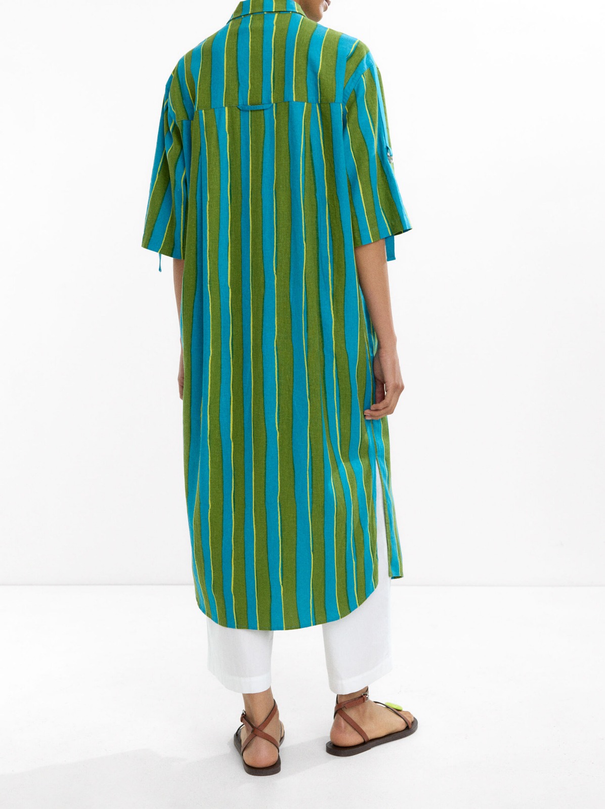 This shirtdress combines breathable linen-blend fabric with a classic striped pattern for effortless wear during warmer months. The relaxed silhouette ensures comfortable movement and versatile styling, perfect for casual outings or weekend brunches. Finished in a multi-tone stripe, it pairs beautifully with neutral footwear and accessories. A wardrobe staple for transitional seasons, this dress blends softness, structure, and timeless pattern play.