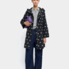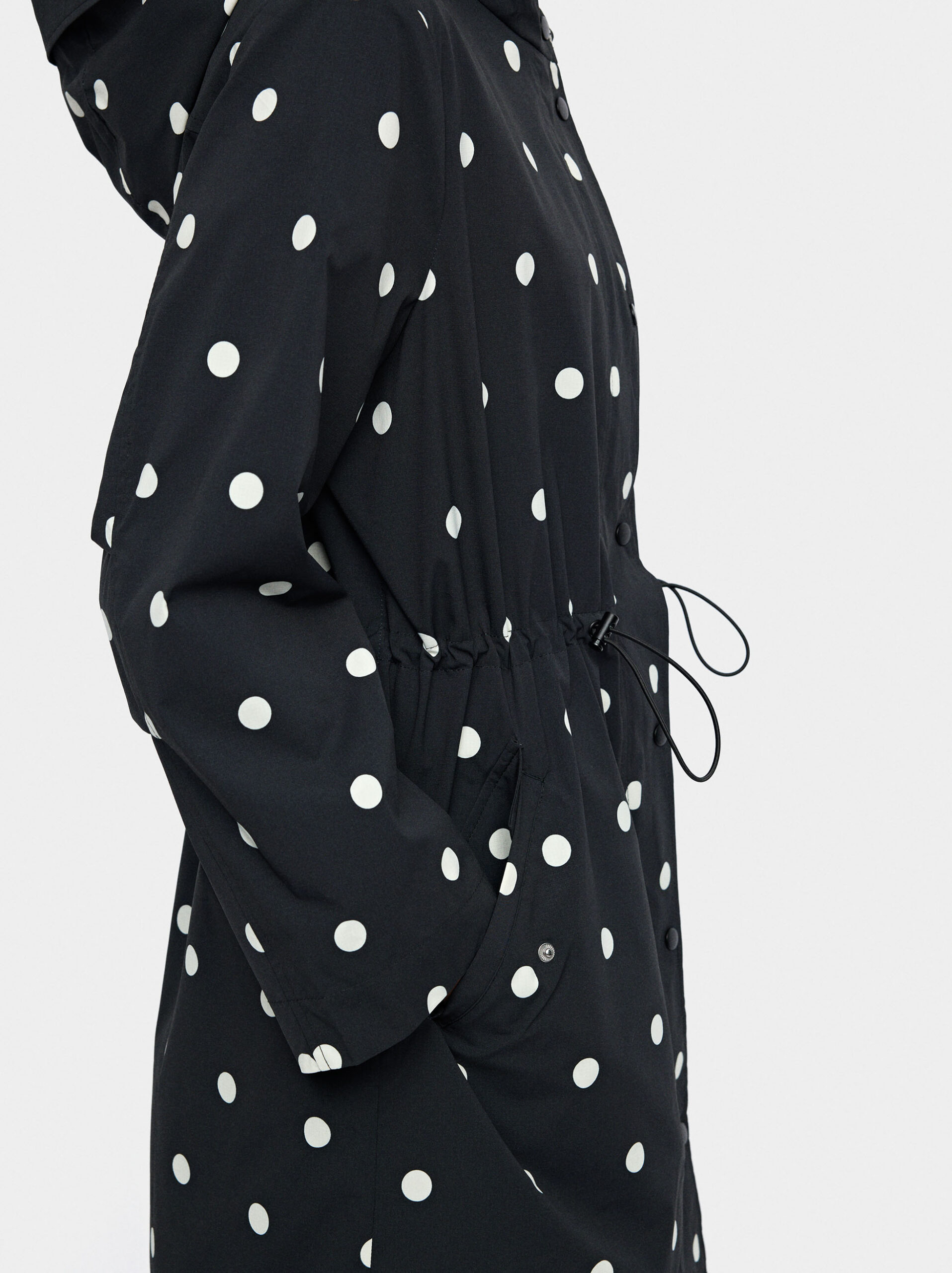 A sleek black parka with subtle polka-dot detailing and a water-repellent finish. Designed with a protective hood, high collar and adjustable waist tape, plus secure zip and snap closures. Side pockets and a flattering cut make it both practical and stylish for wet-weather days.