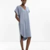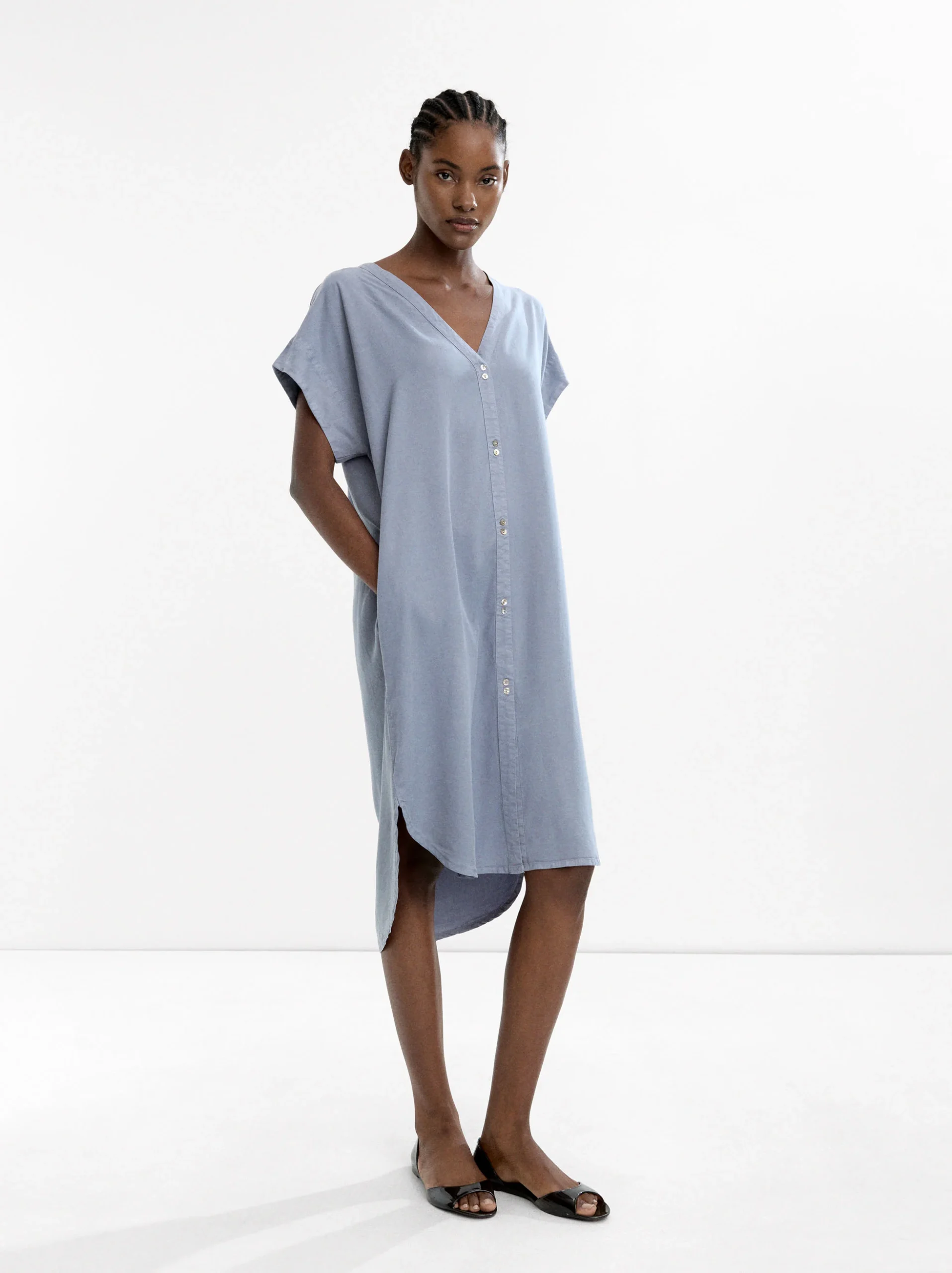 A breezy sky-blue lyocell dress with a flowy silhouette, V-neckline, dropped sleeves, and elegant lower side slits. Soft, lightweight, and perfect for casual days, travel looks, and warm-weather comfort.