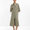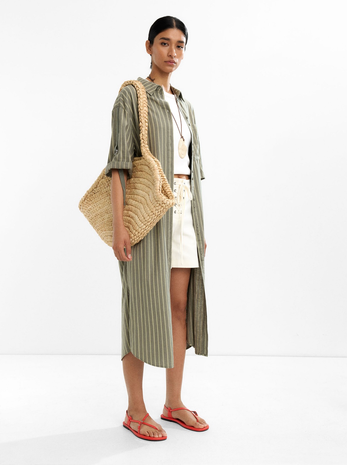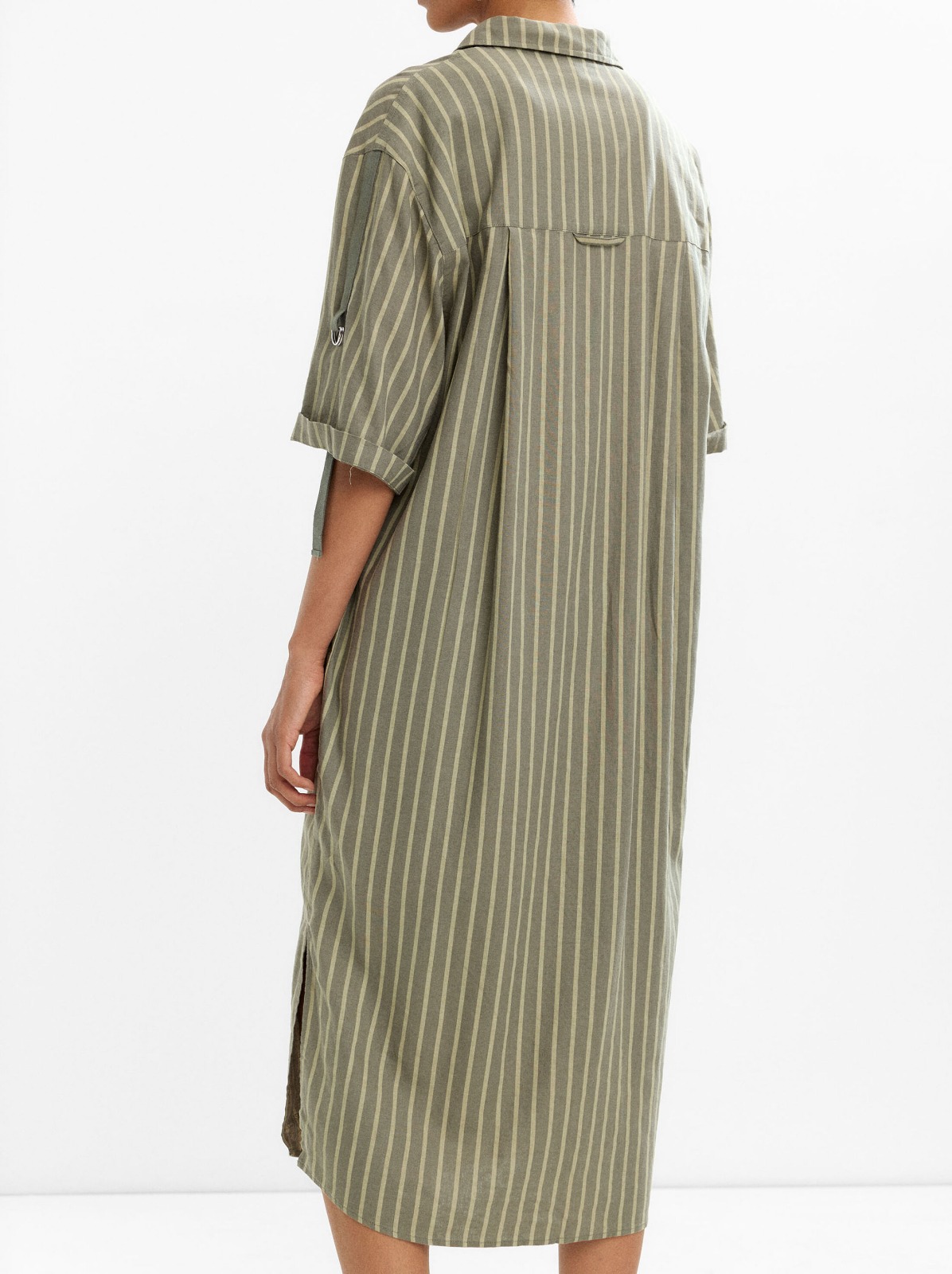 This green striped linen-blend shirtdress offers a breathable and relaxed silhouette crafted for warmer weather wear. The vertical stripes and natural linen-blend fabric create a refined yet casual look that transitions easily from daytime errands to weekend lunches. Designed with comfortable movement and easy layering in mind, it pairs beautifully with sandals or espadrilles for effortless styling. A fresh and versatile piece that brings both structure and ease to your wardrobe.